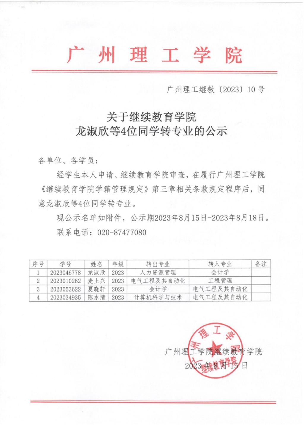 关于继续教育学院2023级龙淑欣等4位同学转专业的公示_