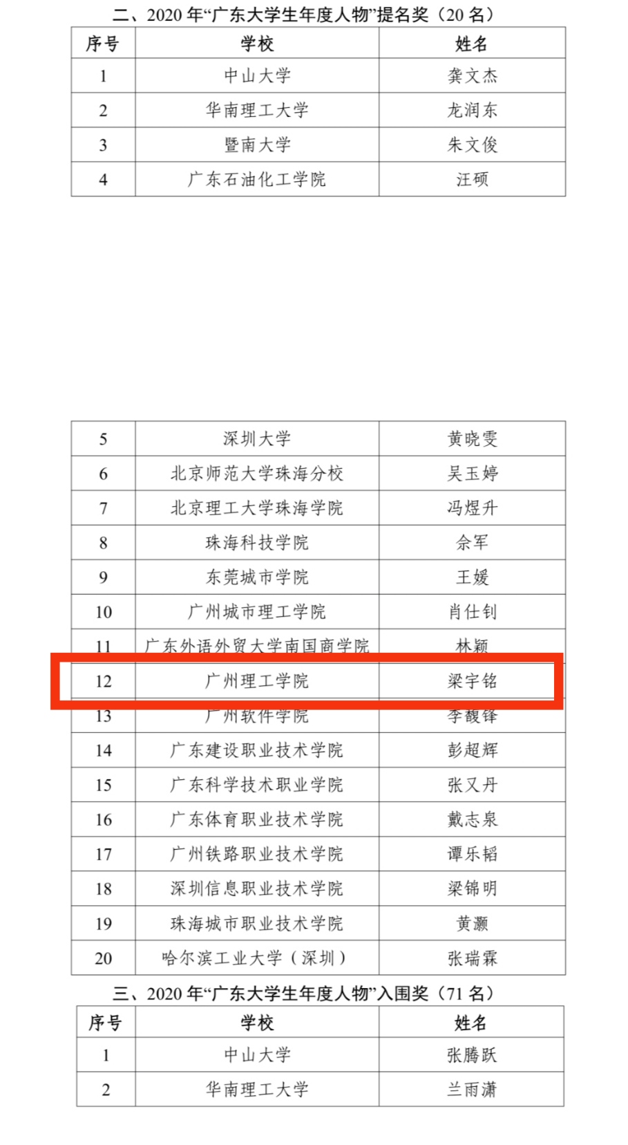 为大力选树高校辅导员、大学生先进榜样,充分展示新时代高校辅导员、大学生昂扬向上的精神风貌,省教育厅组织开展了“2020年广东高校辅导员年度人物”、“2020年广东大学生年度人物”推选展示活动。此次活动共评选出“2020年广东高校辅导员年度人物”10名、“2020年广东高校辅导员年度人物”提名奖20名、“2020年广东高校辅导员年度人物”入围奖61名。“2020年广东大学生年度人物”10名、“2020年广东大学生年度人物”提名奖20名、“2020年广东大学生年度人物”入围奖71名。