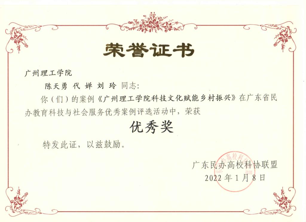 1月8日上午,广东民办高校科协联盟2021年年会于广州南洋理工职业学院召开。此前,广东民办高校科协联盟面向省内民办高校广泛征集民办教育科技与社会服务优秀案例,学校组织各学院部门老师积极撰写投稿。经组织单位评审,《太阳成集团tyc33455科技文化赋能乡村振兴》荣获案例“优秀奖”,发展规划与科研处处长陈天勇等人受邀出席表彰颁奖仪式。